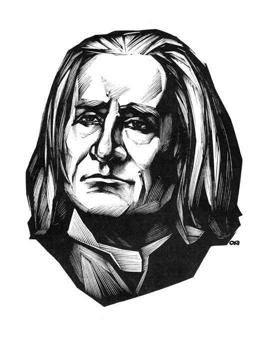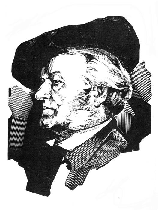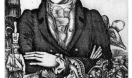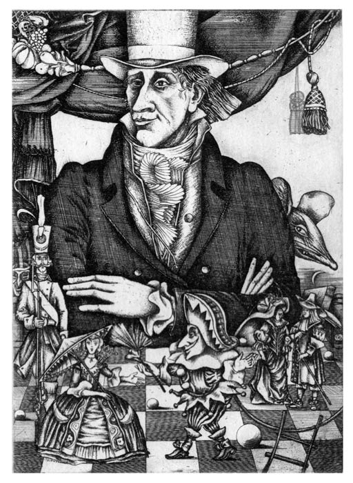 Портретная же задача в изображении Ганса-Христиана Андерсена (1990г.) строилась по принципу: рассказать о человеке-сказочнике в пространстве жизни его героев. Портрет иллюстрирован, причем сюжет принимается здесь не как повод, а как принцип художественного построения, где решаются пластические задачи, варьируется графическое изображение и создается сюжетная насыщенность массой персонажей из произведений автора. Герои сказочника, живущие рядом с ним, как бы овеществляют пространство, «обживают» его как дом. Портретный сюжет приведен к «сказочной» дисциплине, что в какой-то степени даёт возможность собрать в одной иллюстрации сложный комплекс разновременных событий. Здесь уместно сказать об ином принципе восприятия; назовём его игрой в театр, миром старой сказки, где увлекательнее не озорство игры, а таинственность, волшебство атмосферы. Портрет же Андерсена как бы и есть интонация сказочника, дом сказочника.