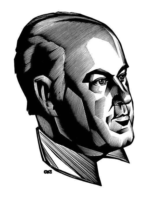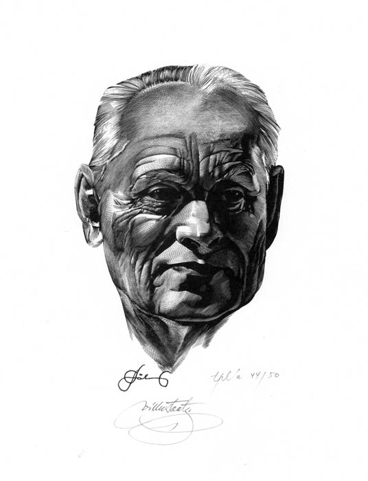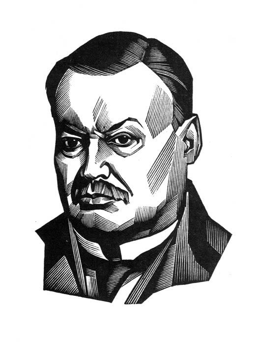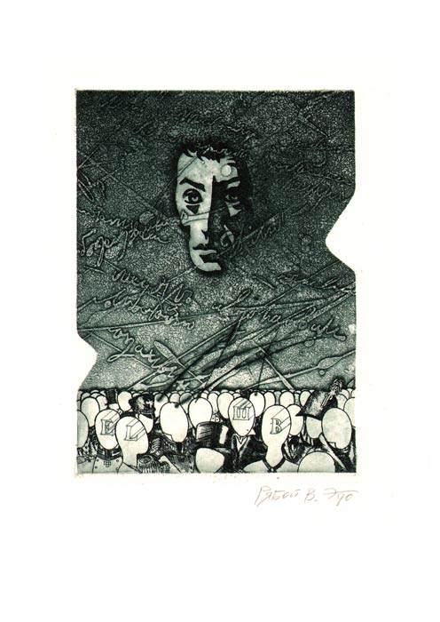 Один из первых малоформатных портретов был выполнен мной в технике «офорт» к сборнику «Афоризмы» Бернарда Шоу в1982 году. Для современного человека афоризм достаточно отвлеченная форма: это фраза, витающая сама по себе и являющаяся «подарком» читателю. Мысли автора, освещенные светом духовной жизни, казалось бы, дают повод графику к рациональному «цитированию» высказанного, придавая утончённости языка особую скрытую артистичность. Иллюстратор, работая с материалом этого уровня, неизбежно приближается к мысли подменить метафору жизни сюрреалистическим смыслом. Все это не может не найти отражения в портрете Б.Шоу, который выполнен с фотографической точностью, в подражательной манере, что контрастирует с самими произведениями мастера афоризмов.