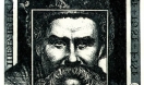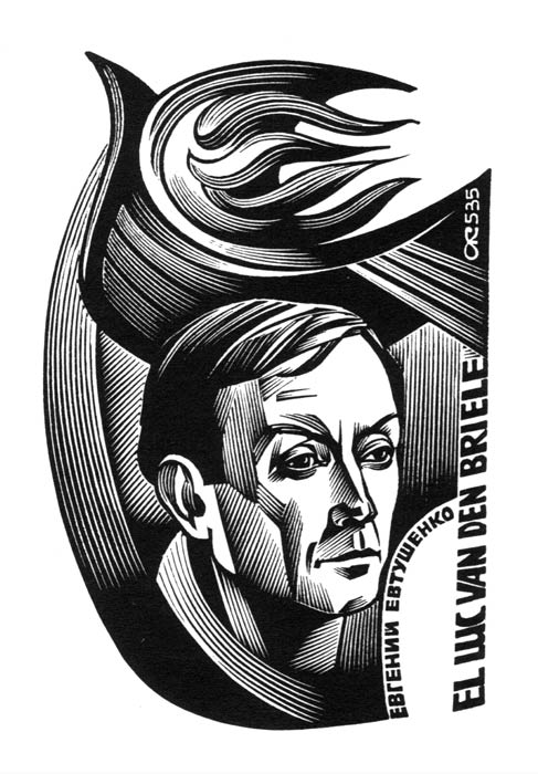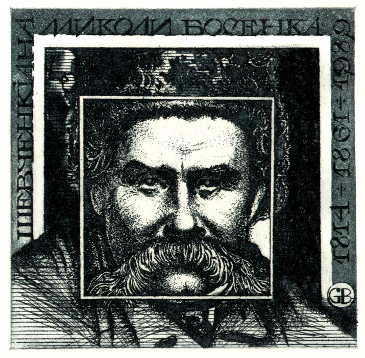 «Прямой» подход к мотиву и образу портрета Тараса Шевченко в книжном знаке Миколи Босенка(1989г.) показался мне наиболее выразительным. Организуя композиционно портретное пространство, я создал ступенчатую углублённую раму, в центре которой помещён образ поэта: так удалось соподчинить меру и пропорции основных конструктивных ритмов и движение пластических масс.