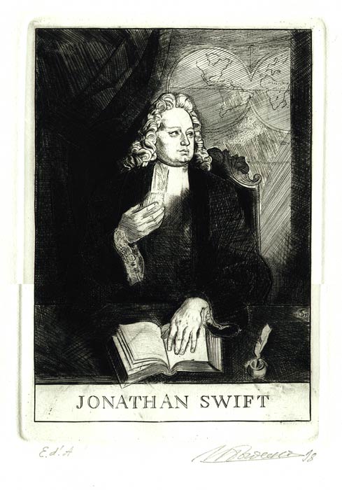 Роман «Путешествие в некоторые отдаленные страны света Лемюэля Гулливера, сначала хирурга, а потом капитана нескольких кораблей» Дж. Свифта принадлежит к одной из величайших книг сатирического направления в мировой литературе. Ясность стиля и творческий подход И.Богдеско, в большей мере, проявились в портретном изображении великого сатирика и гуманиста на фронтисписе книги. Портрет Джонатана Свифта (1998г.) - это классический исторический портрет, воссозданный мастером по воображению, на основе литературно-художественного материала. Согласно историческому канону портретируемый представлен в сюжетной взаимосвязи с окружающими его миром необходимых вещей: книга, карта, ручка и чернильница. Мотив предписывает определённую трактовку. Композиция представлена в виде театрализованного исторического интерьера. Образно-художественный строй портрета Дж. Свифта подчинен отражению основных сюжетно-смысловых линий этого сатирического романа. Реалистический портрет автора произведения строится на контрасте с сатирическими иллюстрациями, перерастающими порой в гротеск. И.Богдеско, в полной мере, показывает достоинства своего дарования рисовальщика, используя разнообразные изобразительные приемы резцовой гравюры на меди во всем её блеске и красоте