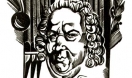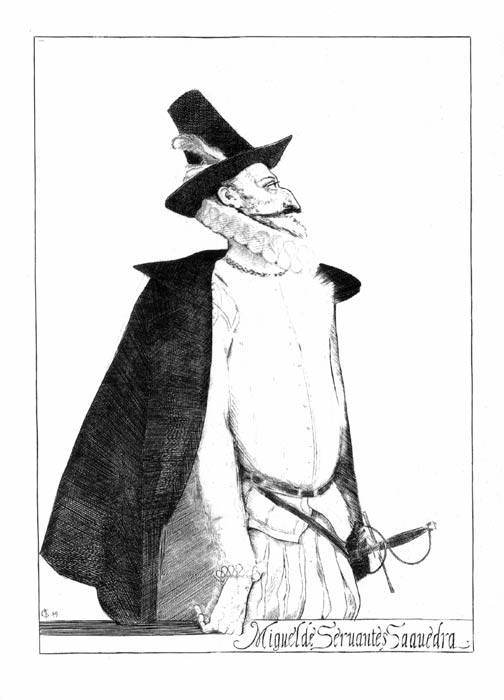 В портрете Мигеля Сервантеса (1996г.) выбор композиции художником по-прежнему точен, тщателен и всецело подчинён смысловому раскрытию образа писателя, а не внешней занимательности. Построение фигуры, взгляд, постановка руки, взаимодействие белого фона с прорезанными черными линиями, а так же награвированный шрифт рукописного начертания, ненавязчиво дополняющий портрет, вводят нас в определенное историческое время, в портрет