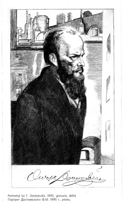 Примечательно и то, что в портрете Фёдора Михайловича Достоевского (1995г.) И.Богдеско уделяет большое внимание показу окружающей предметной среды, акцентируя внимание на городской архитектуре. Это позволяет художнику лучше выявить смысловой подтекст и внести в образный строй портрета определенный эмоциональный оттенок. Достоевский «находится» в характерной среде, в которой живут его герои. Равномерно утончающиеся концы награвированных линий, частота штриха и «серебряный блеск» - все это признаки классической резцовой гравюры.