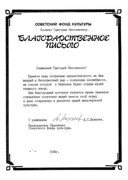 Я обратился в Молдавское отделение Советского фонда культуры с предложением передать ему мою собственную коллекцию книжных знаков и тематическую библиотеку с условием, что будет открыт специализированный музей экслибриса.