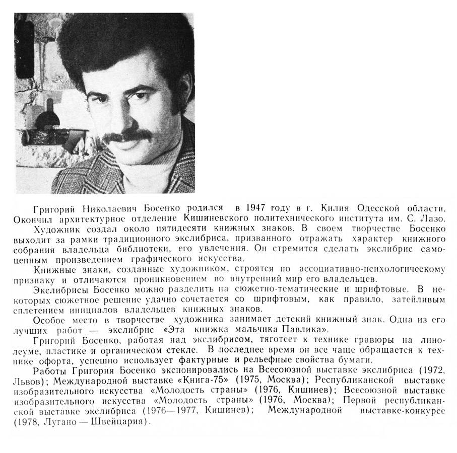 Григорий Босенко, работая над экслибрисом, тяготеет к технике гравюры на линолеуме, пластике и органическом стекле. В последнее время он все чаще обращается к технике офорта, успешно использует фактурные и рельефные свойства бумаги.